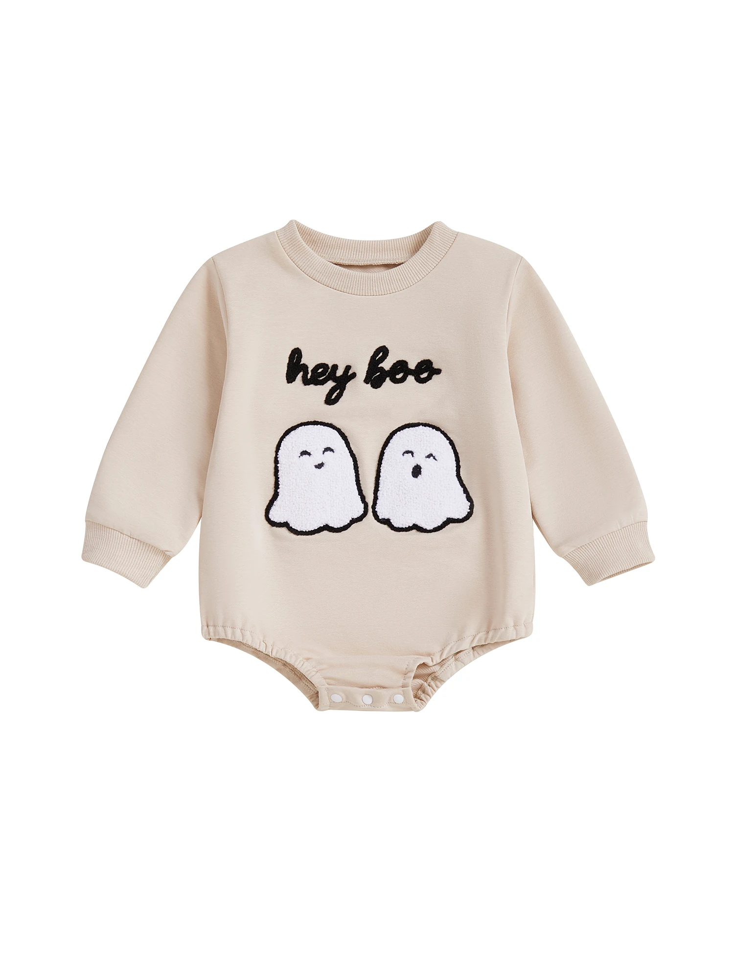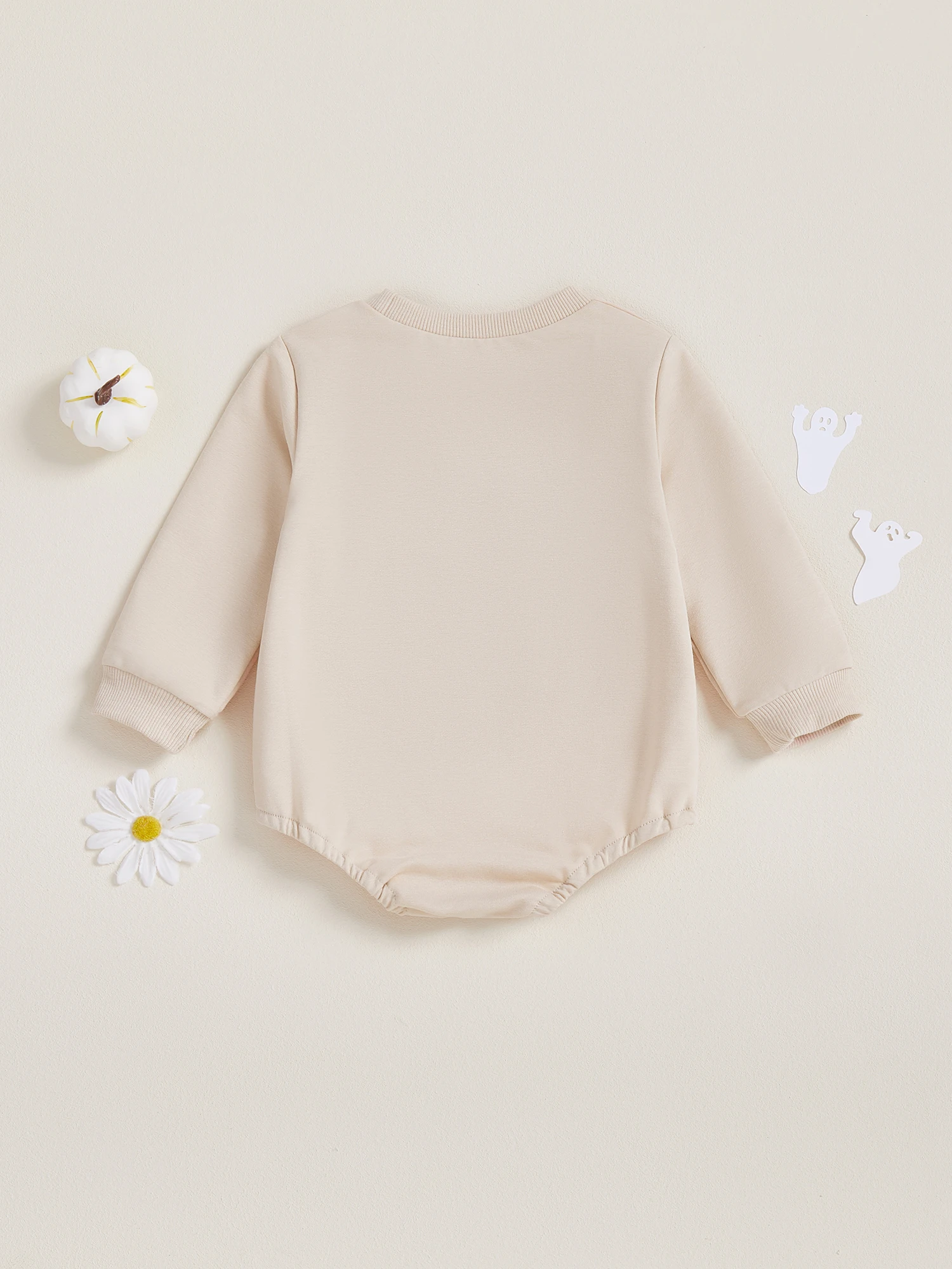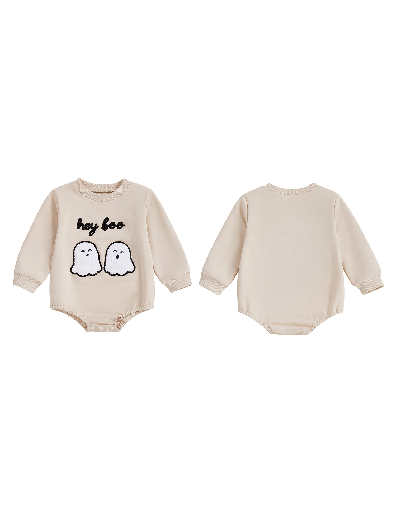 0-18M Newborn Baby Halloween Romper Letter Ghost Embroidered Crew Neck Long Sleeve Jumpsuit for Fall
