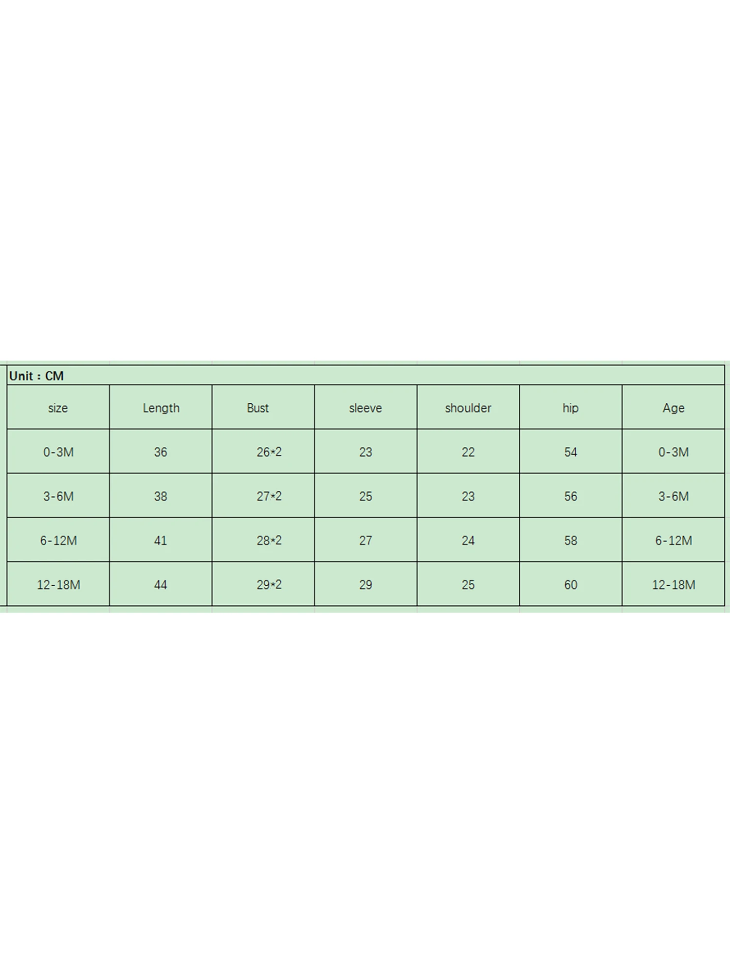 3-6M Length: 14.96 Bust: 21.26 Shoulder: 9.06 Sleeve: 9.84 Hip: 22.05 Advised Age: 3-6 Months