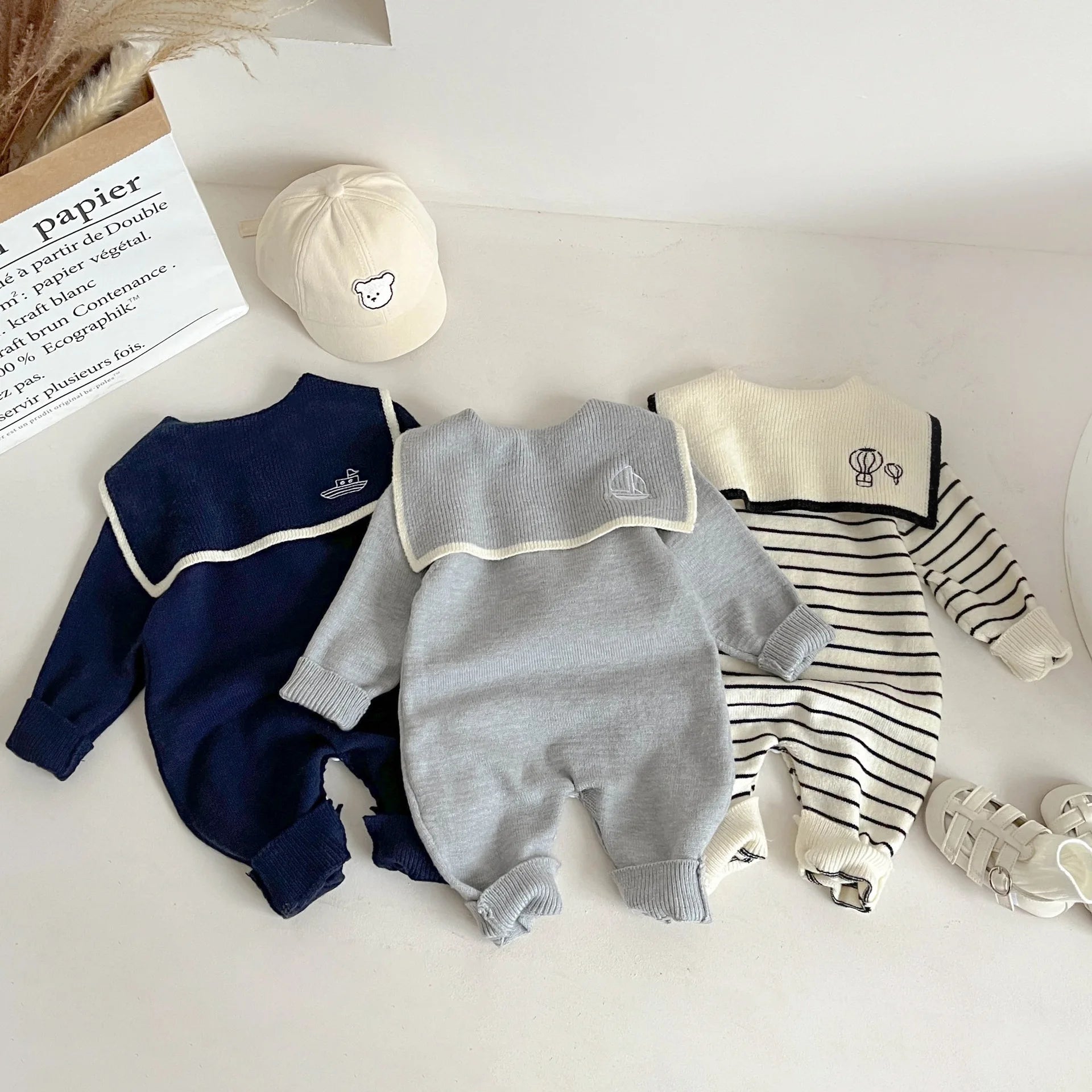 2025 Autumn New Baby Sailor Collar Long Sleeve Knitted Romper Infant Boy Girl Casual Striped Jumpsuit Newborn Toddler Clothes