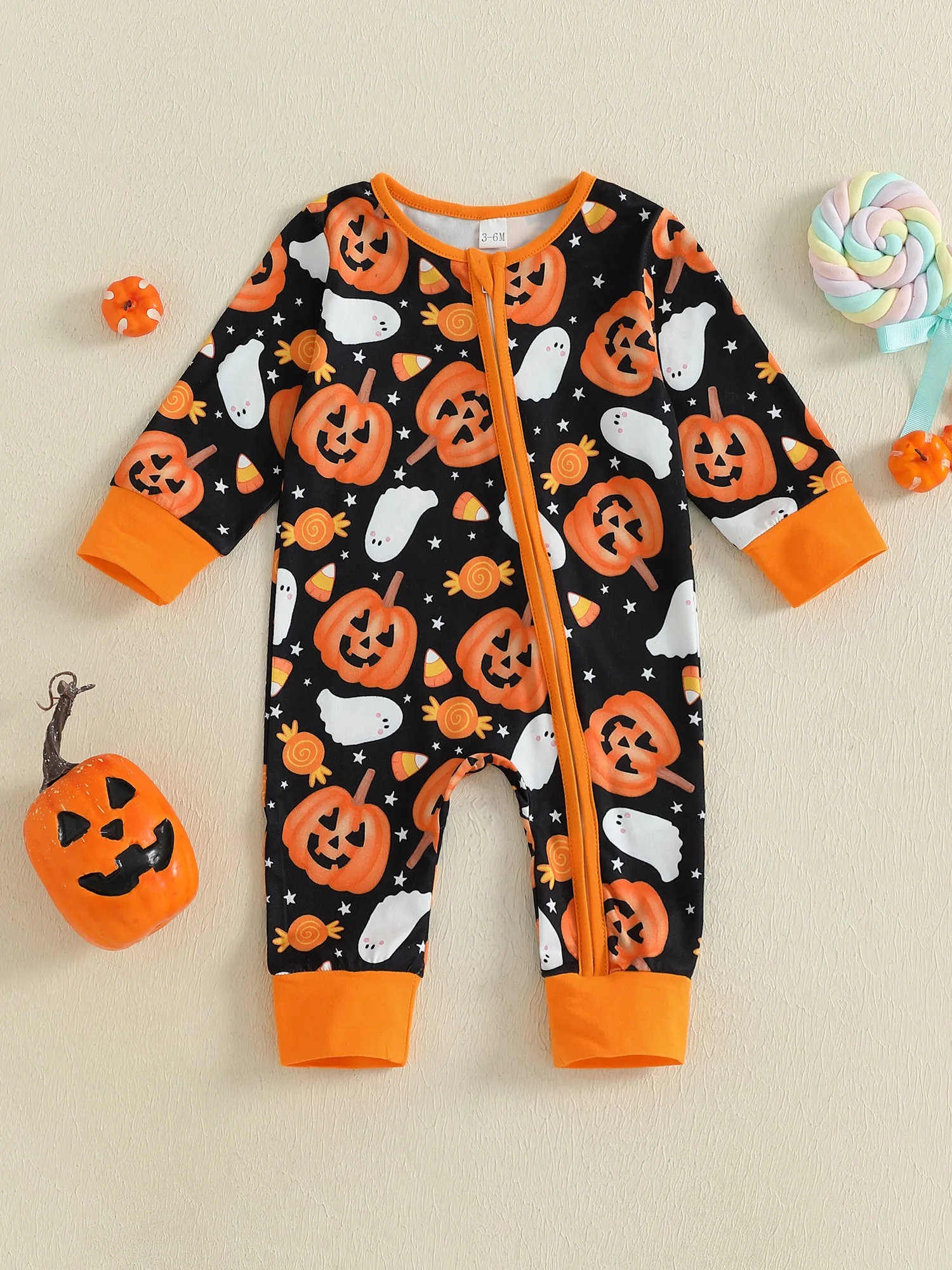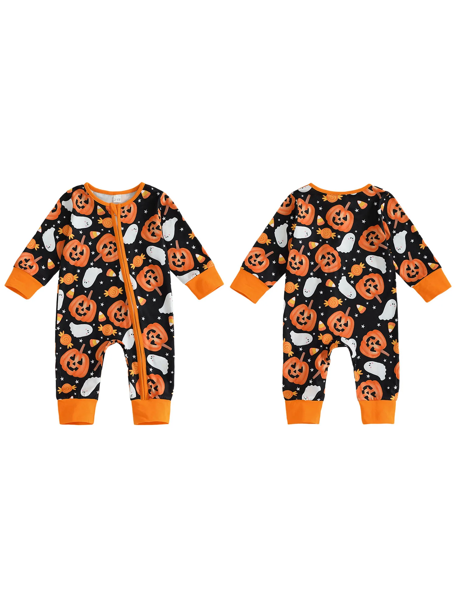 Baby Boys Halloween Zipper Jumpsuit Long Sleeve Crewneck Ghost Pumpkin Print RomperSize (cm)