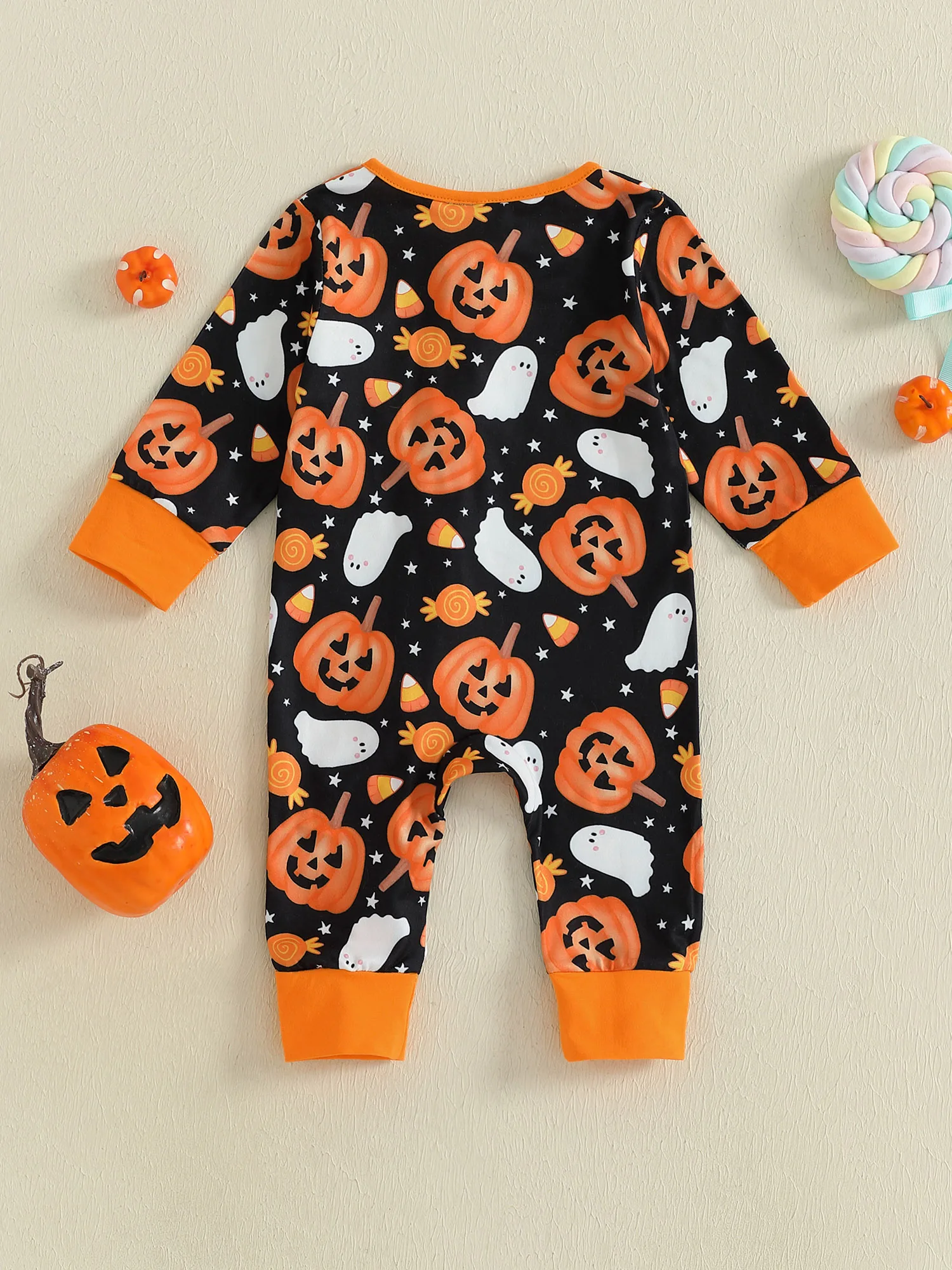 Baby Boys Halloween Zipper Jumpsuit Long Sleeve Crewneck Ghost Pumpkin Print Romper