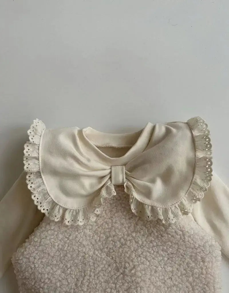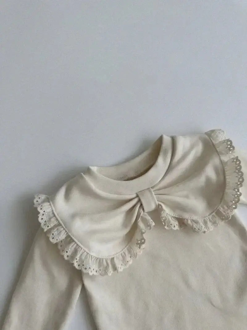 The shirt features a turn-down collar and full-length sleeves, making it ideal for autumn wear. The delicate lace details on the bottom add a charming touch, elevating the overall look. With a pullover closure, it's easy to put on and take off, making dressing your little one hassle-free.