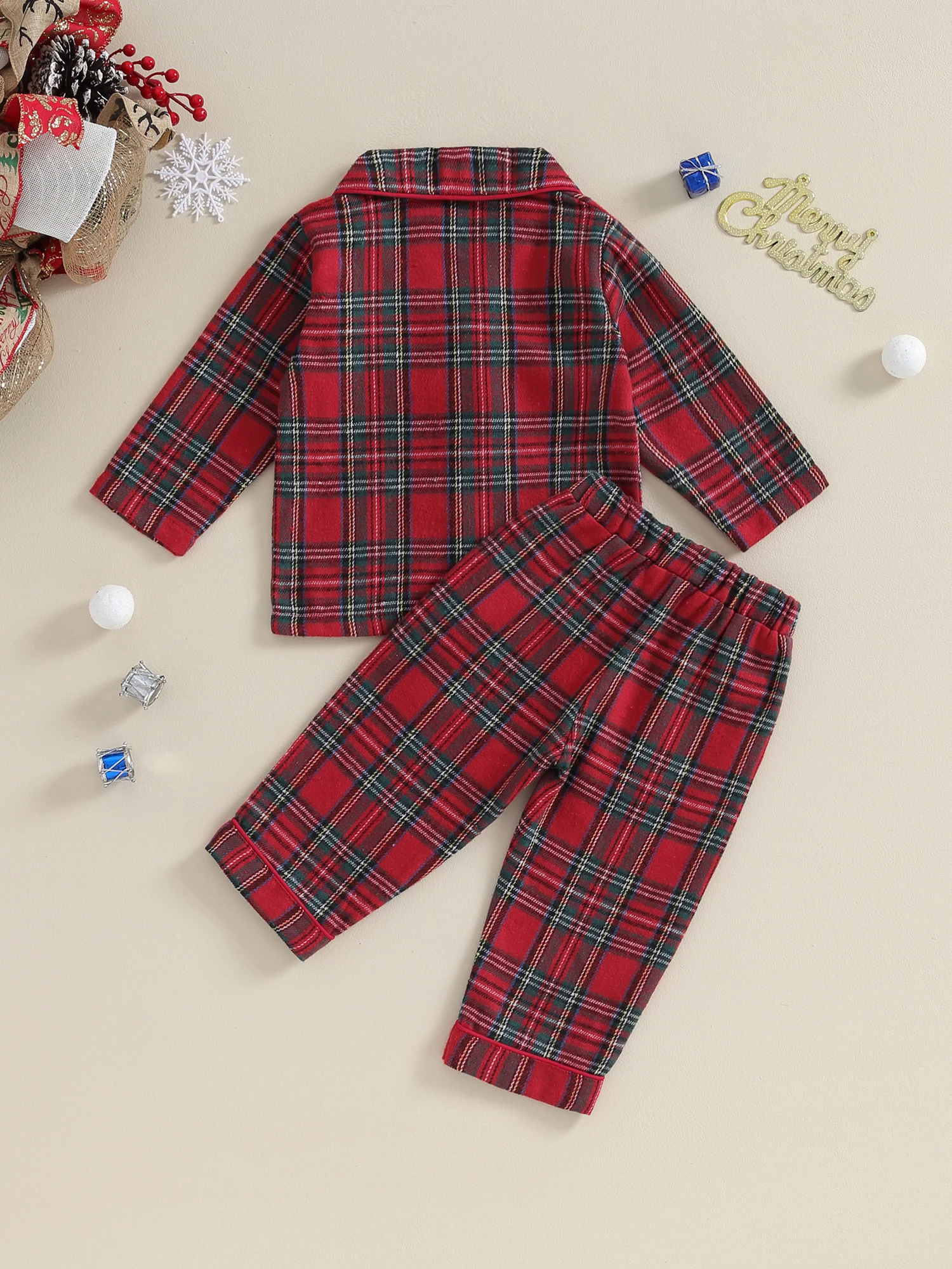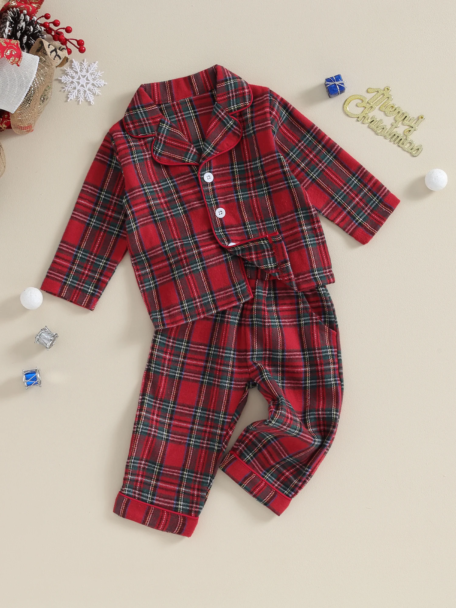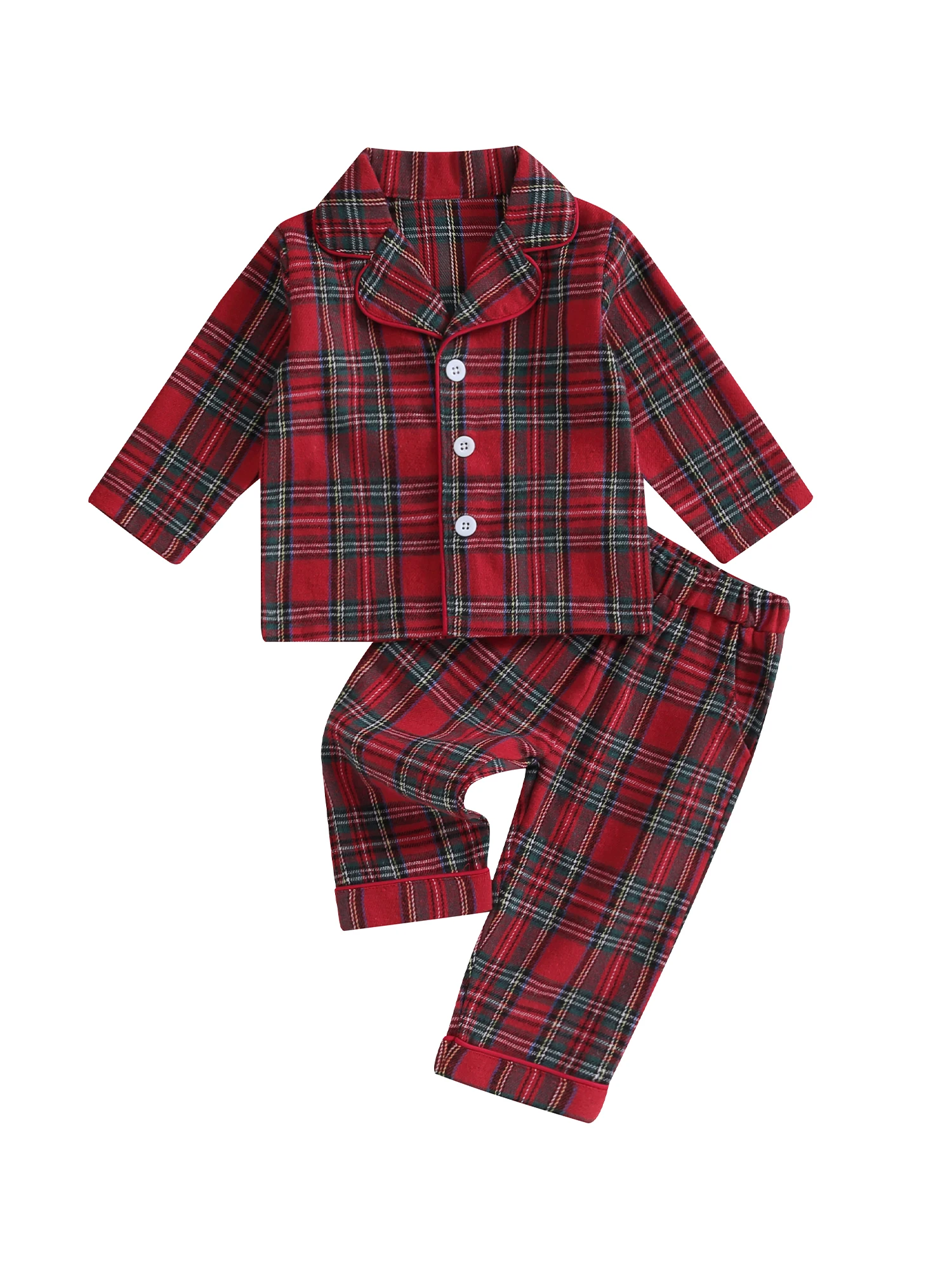 Christmas pajamas for kids, plaid print, unisex design, very cute. Baby pajama top features long sleeves, button closure and lapel collar for easy on and off. The elastic waist of the pants ensures a snug fit, making it a cute and comfy sleepwear.