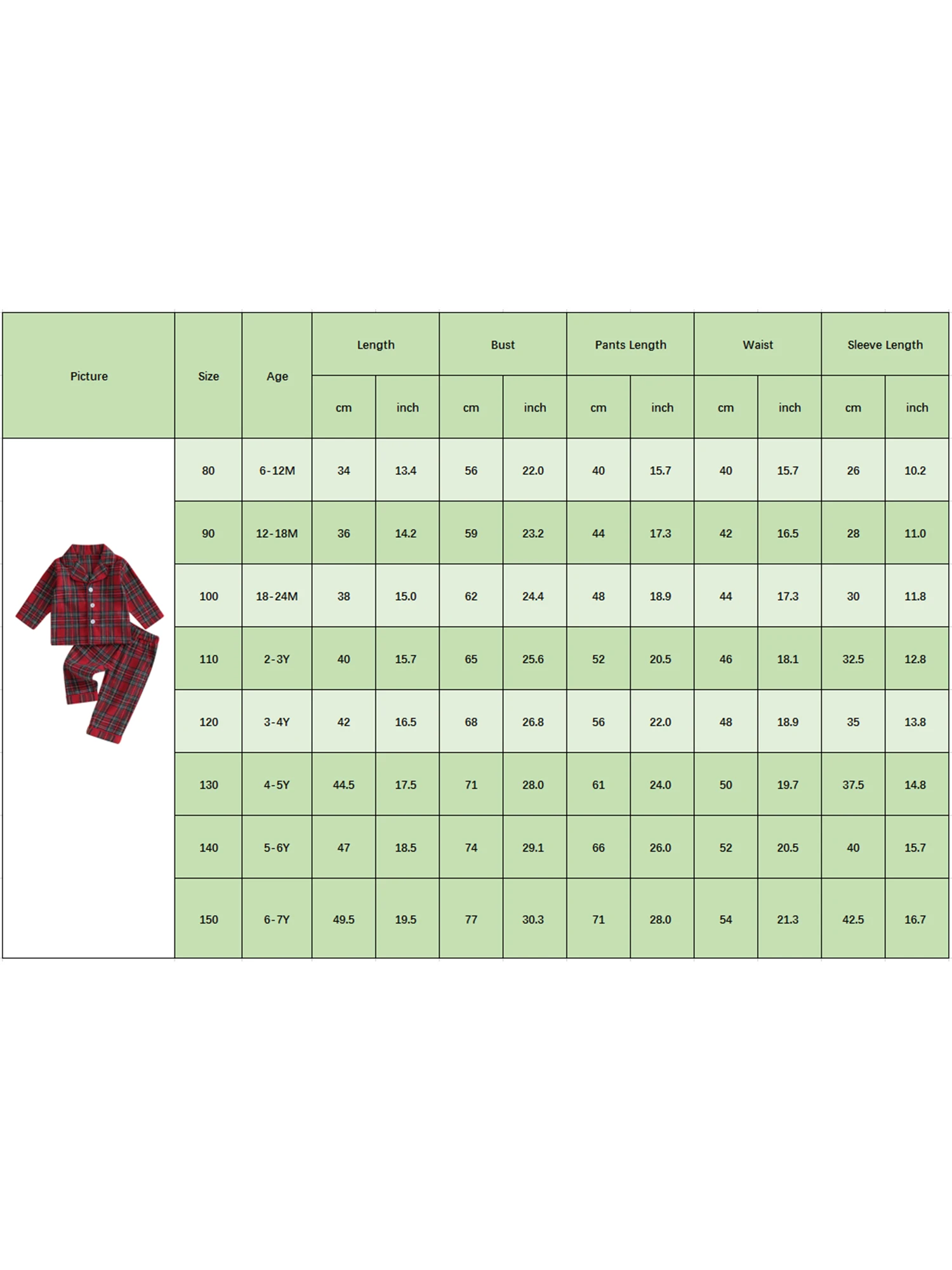 150 Advised Age: 6-7 Years Tops Length: 19.49 Bust: 30.31 Pants Length: 27.95 Waist: 21.26