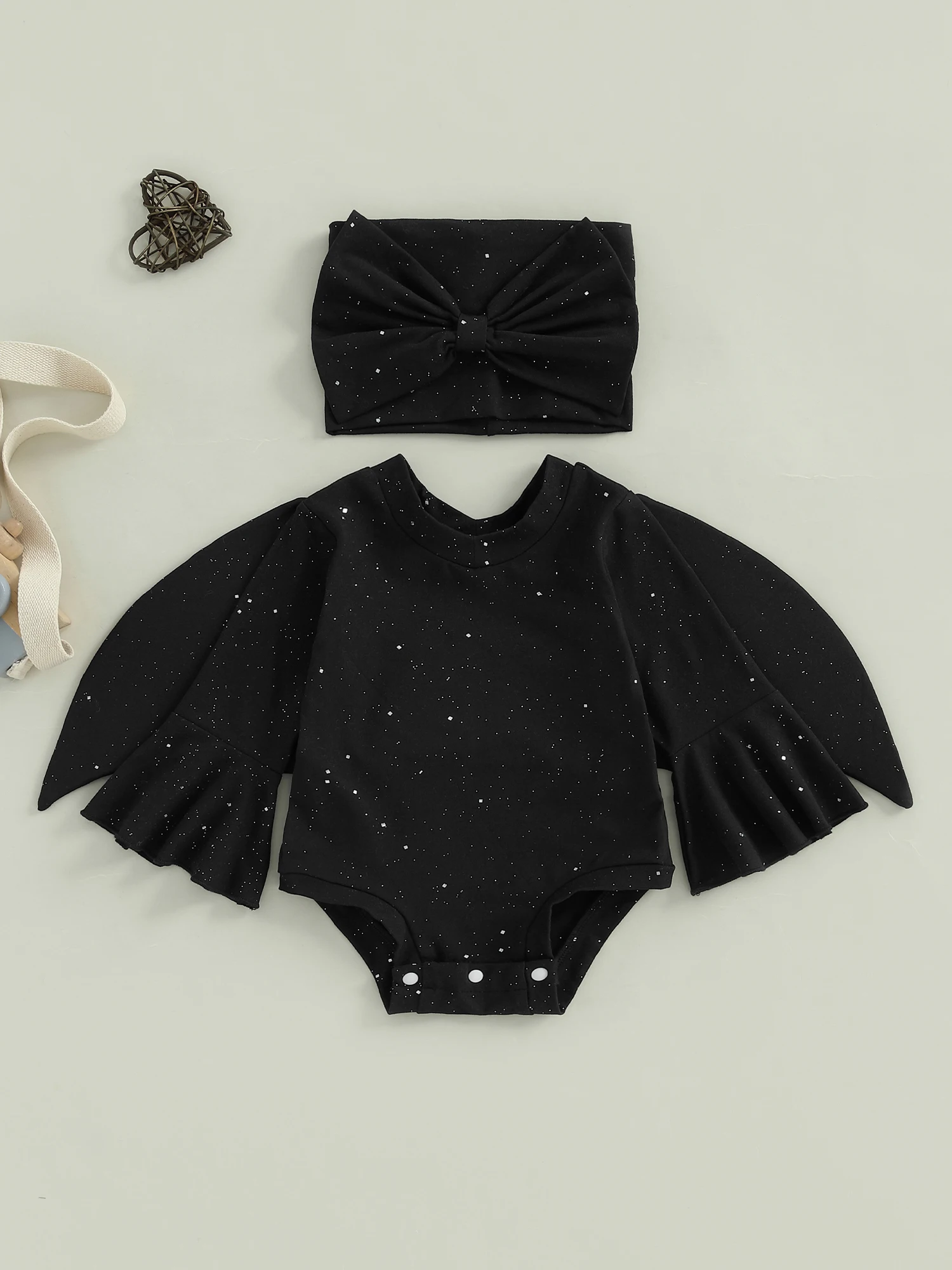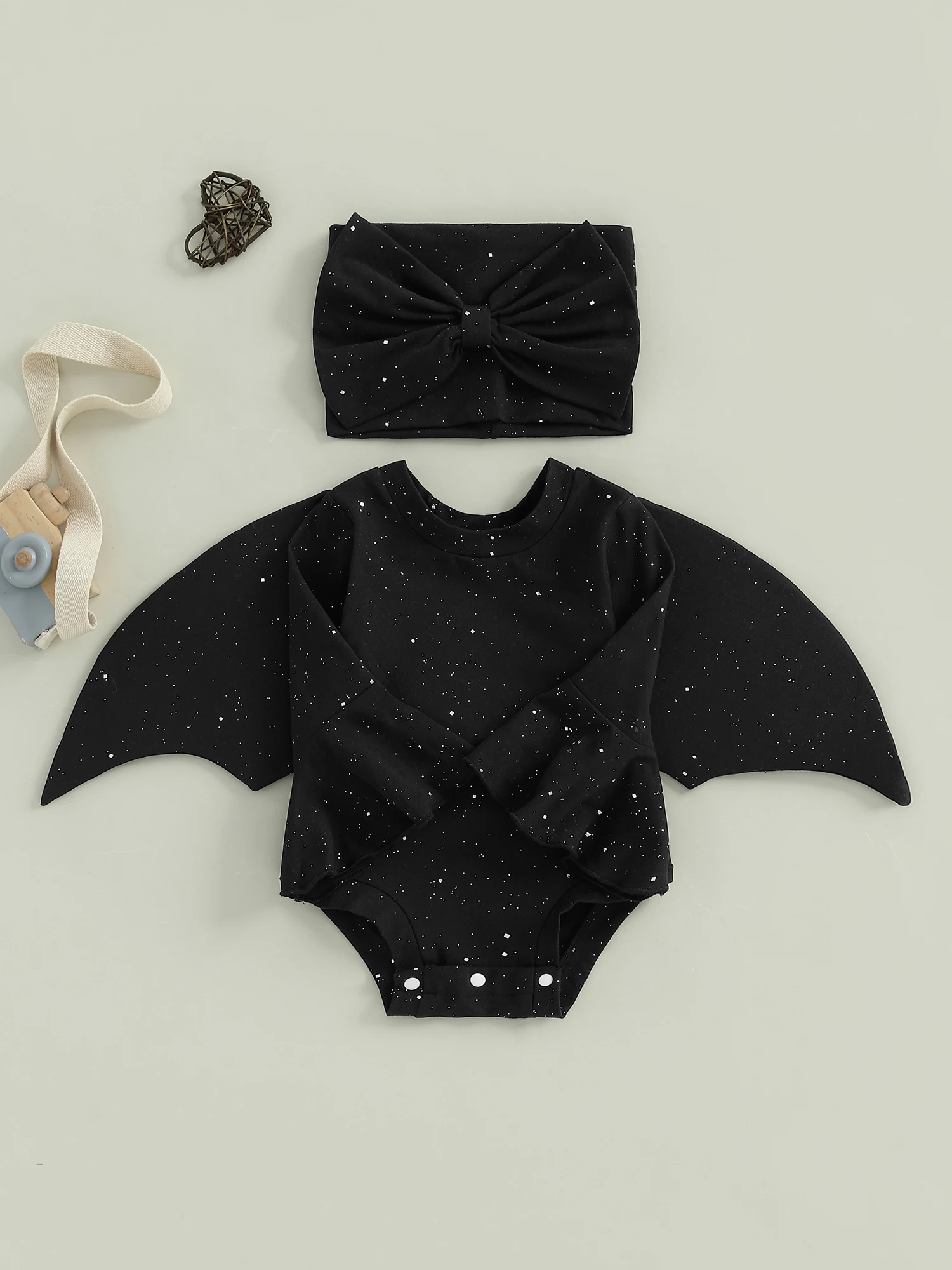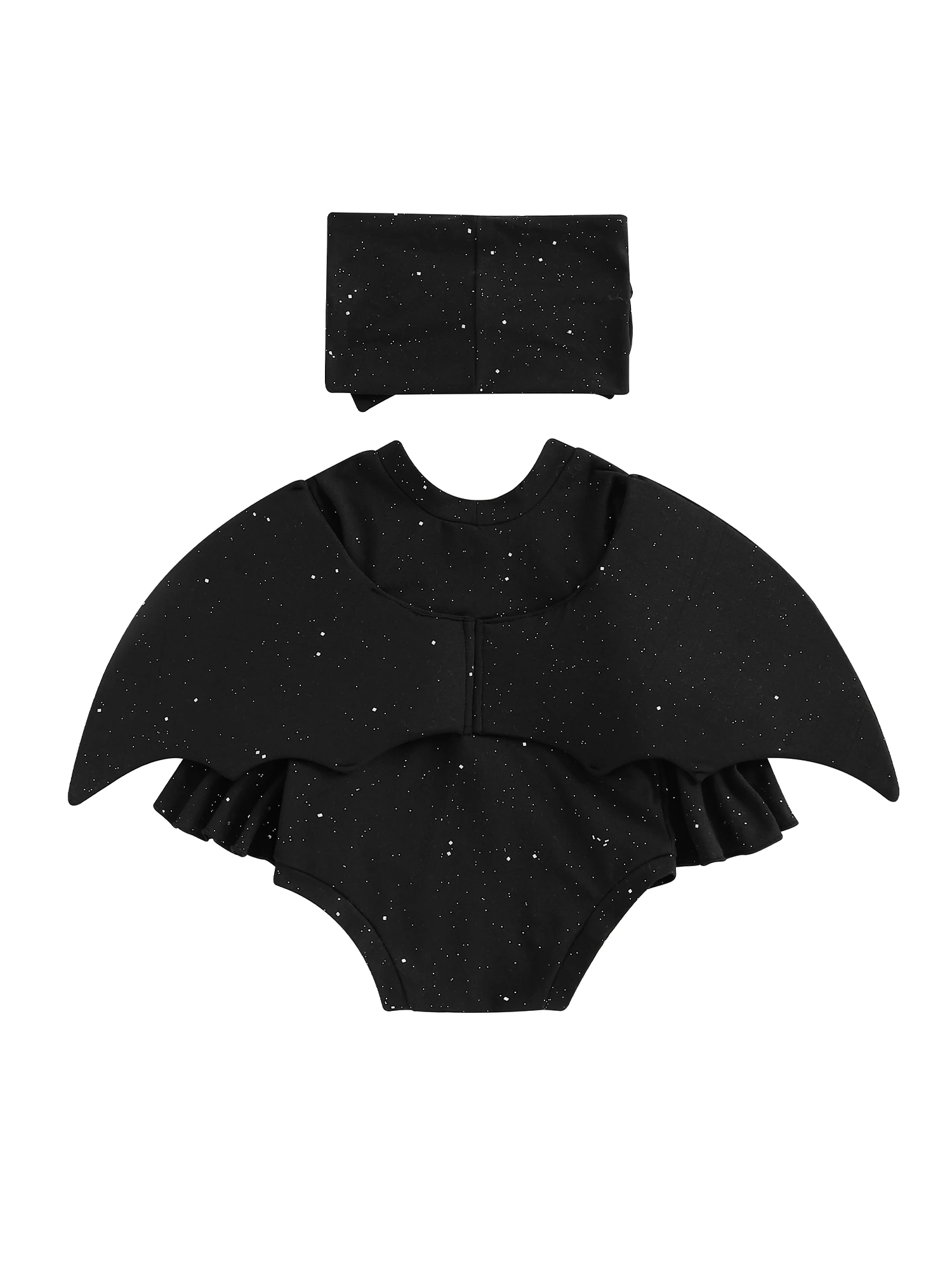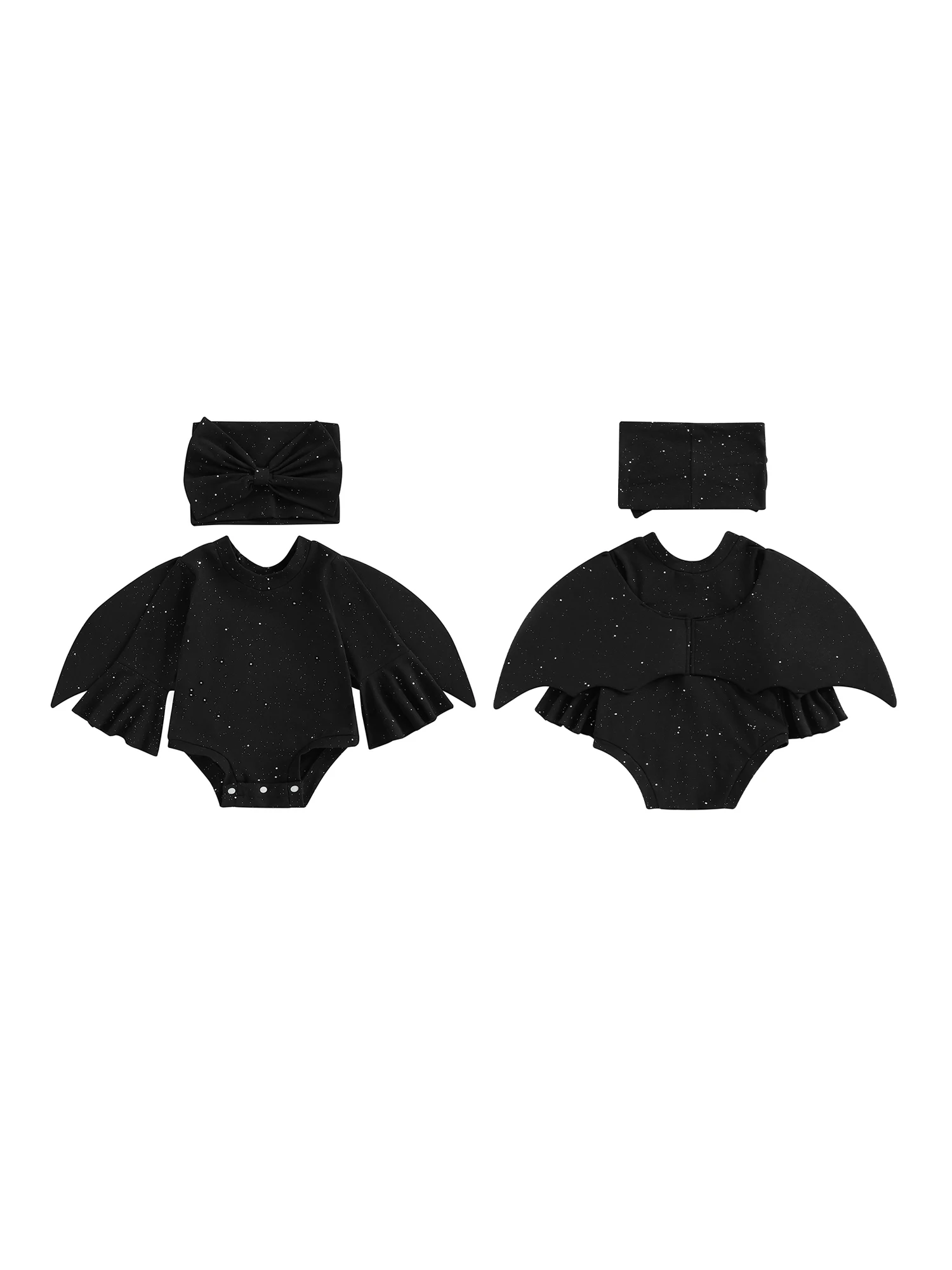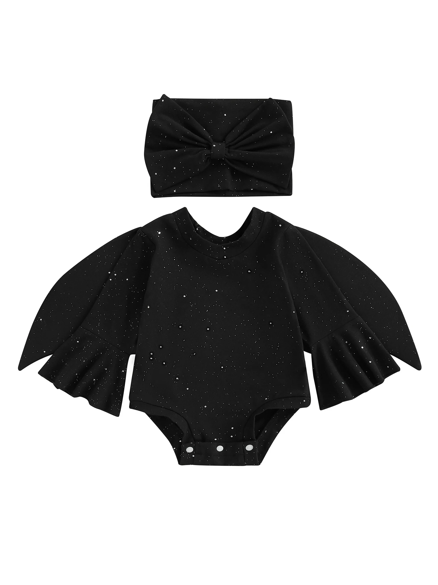 Toddler Baby Girl Bat Costumes Glitter Batwing Long Sleeve Romper with Bow Headband 2 Piece Halloween Outfit