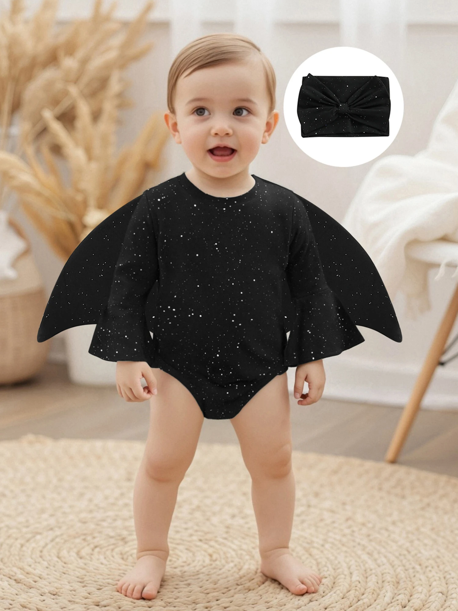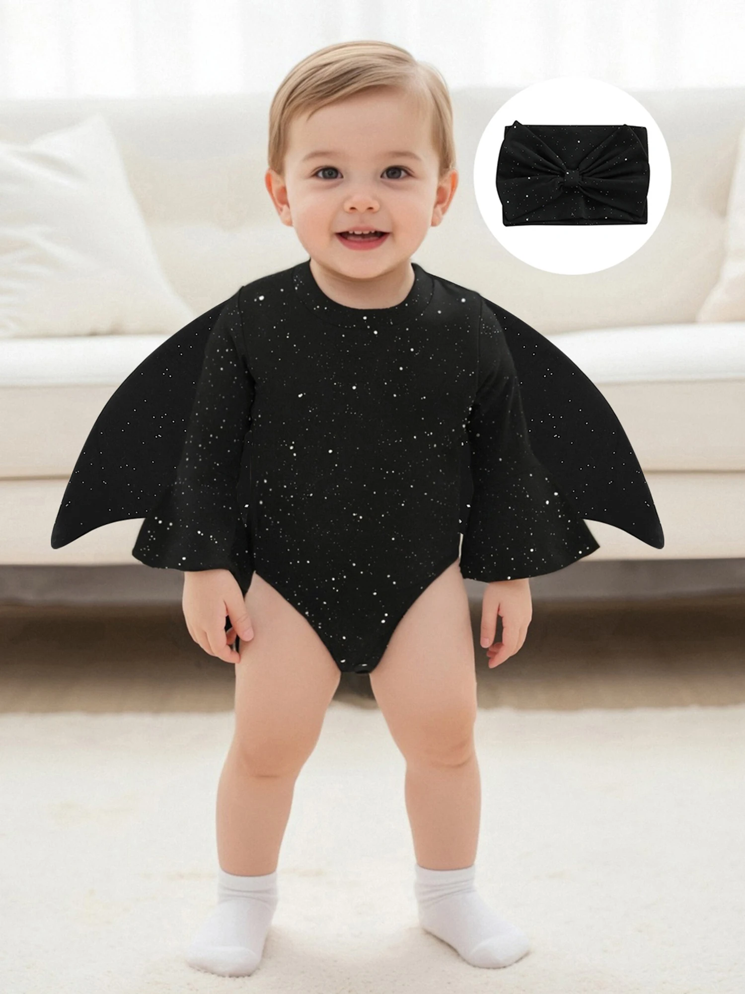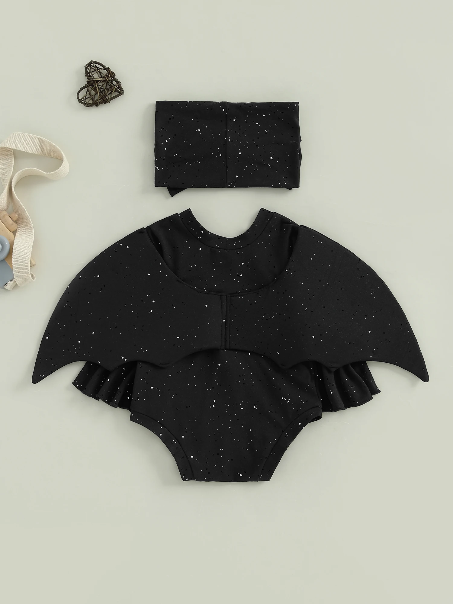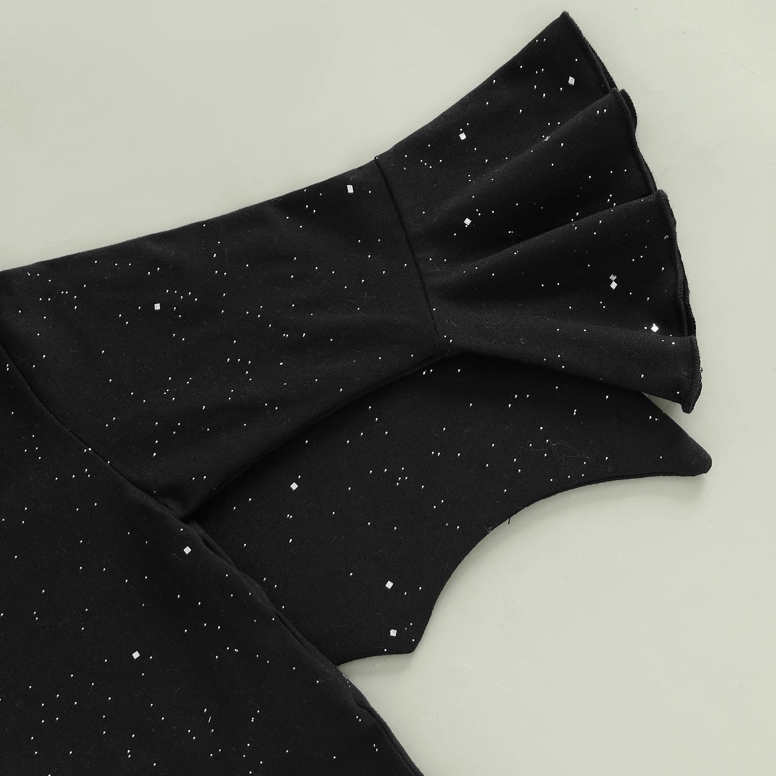 Toddler Baby Girl Bat Costumes Glitter Batwing Long Sleeve Romper with Bow Headband 2 Piece Halloween Outfit