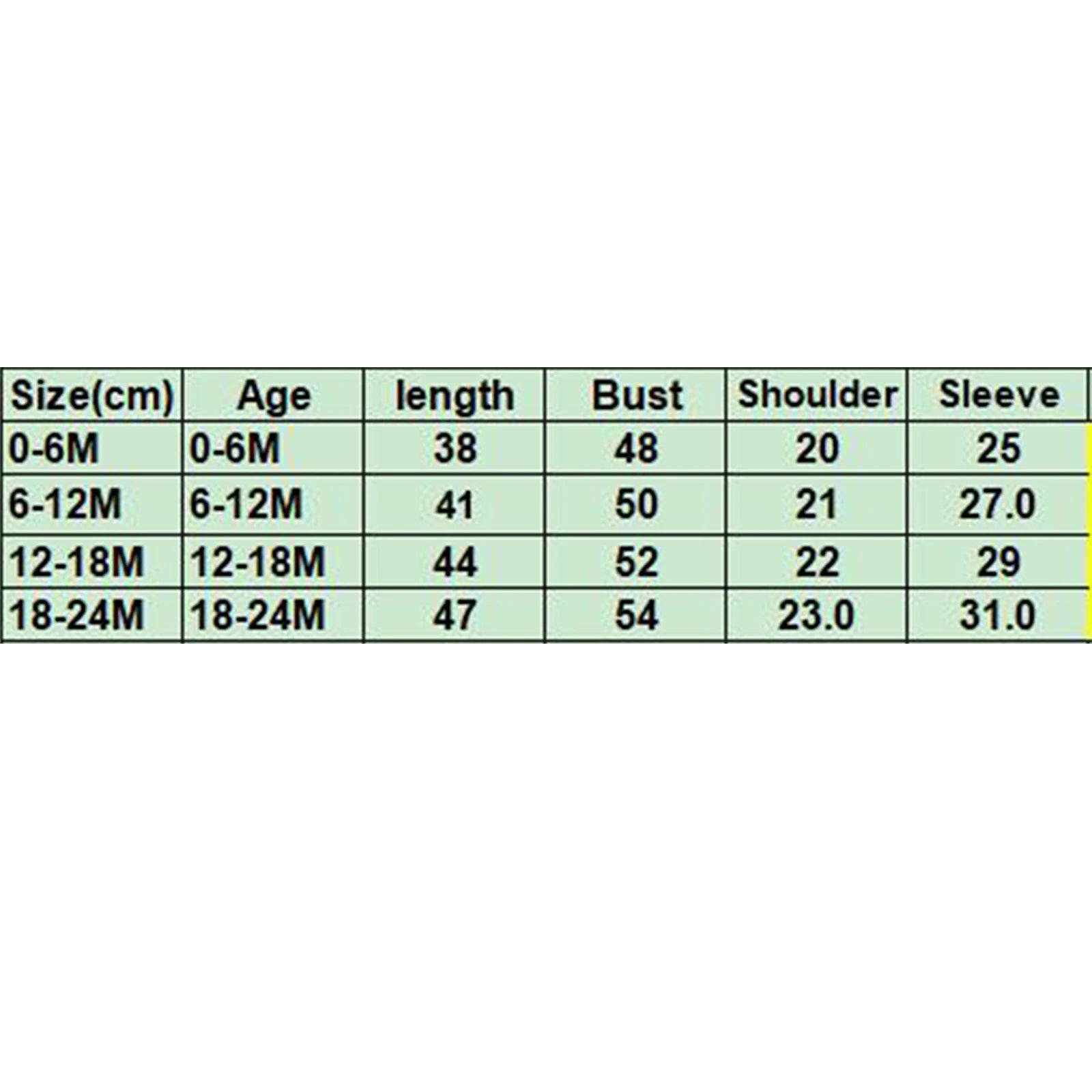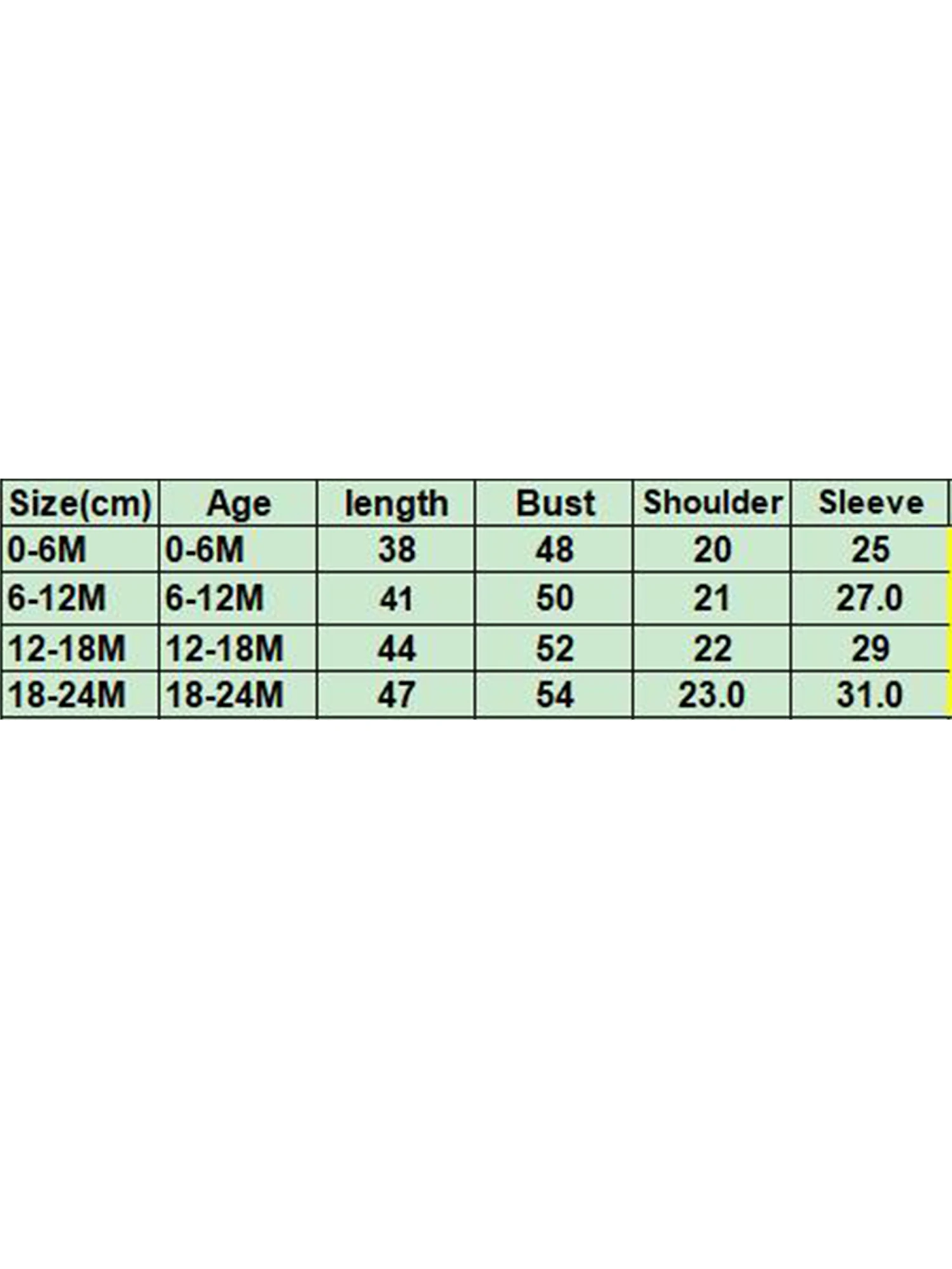 0-6M Length: 14.96 Bust: 18.9 Sleeve: 9.84 Shoulder: 7.87 Advised Age: 0-6 Months